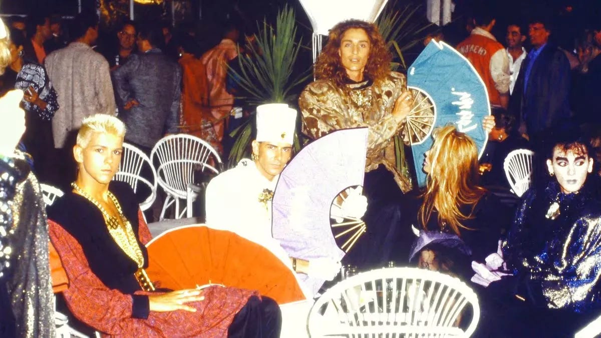 Locomía were a Spanish group who made their name in the 1980s. With their extravagant and instantly recognisable shoulder pads, pointe shoes, and fan twirling theatrics, the group were perhaps best globally known for their eponymous hit in 1989. Their accidental rise to fame is intertwined with Freddie Mercury’s bacchanalian antics in Ibiza in 1987 where all sorts of tales and urban myths have spread about a birthday party he held at Pikes Hotel, which later moved on to KU, the largest open-air discotheque in the world at the time. By chance, that same evening a Catalan designer and dancer Xavier Font and his 15 strong go-go troupe were performing at one of KU's bars. Font had been alerted that Mercury and his friends were on their way to continue the party.